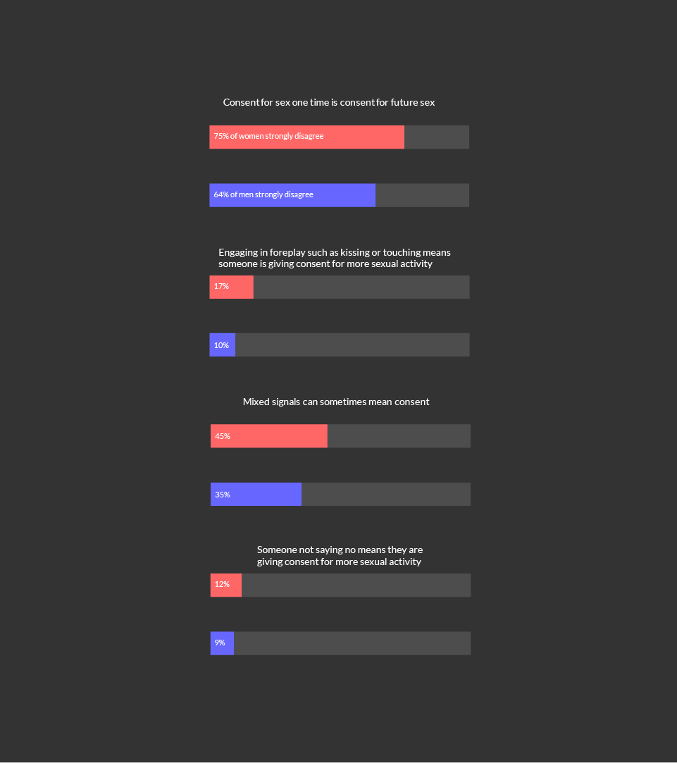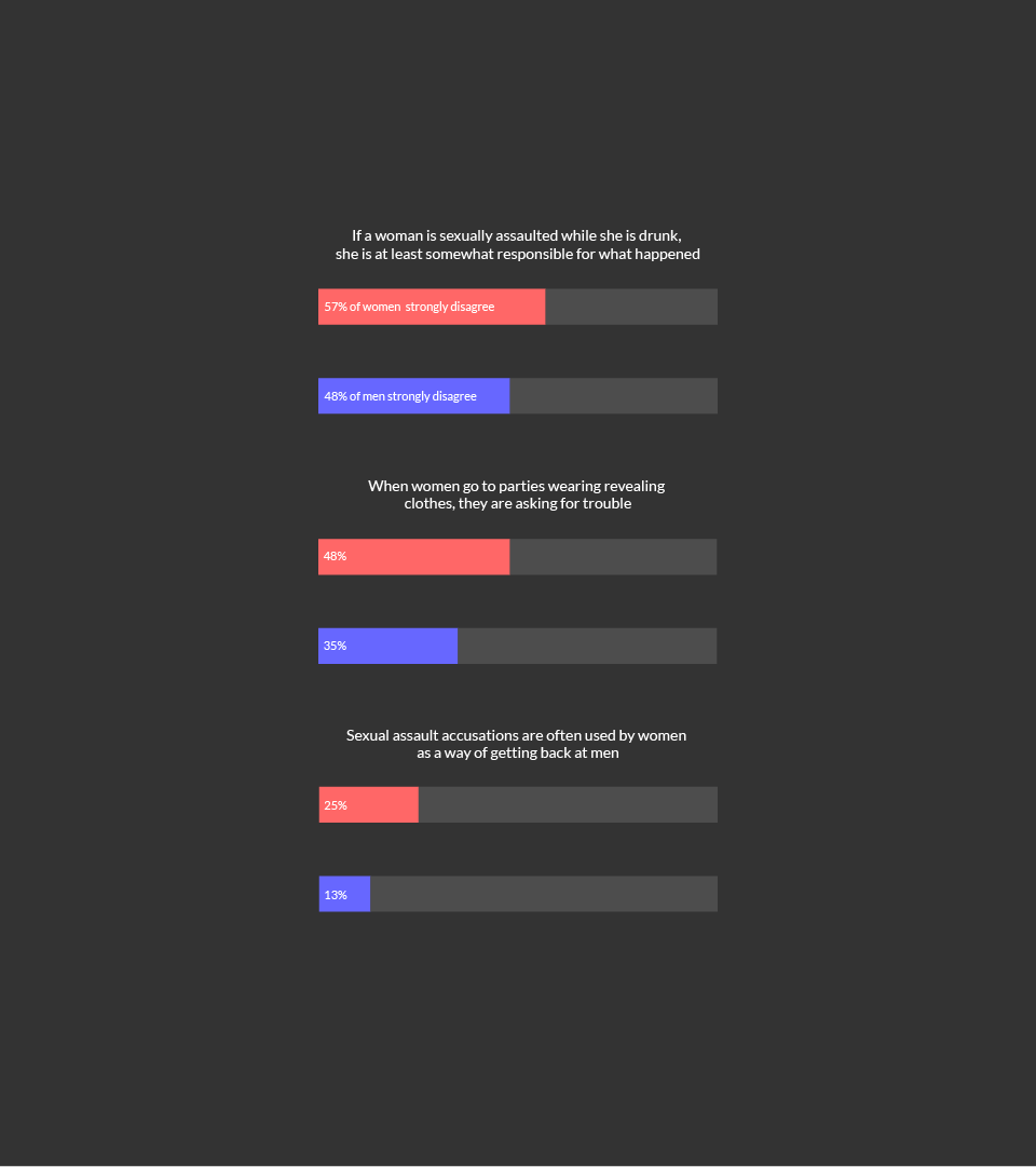 People also held differing views on what entailed sexual assault, and who was to blame for it. This causes significant problems on a macroscale level when law and order are decreed by those who do not have an understanding on these matters. Most reported that they did not get education about consent and sexual assault in middle or high school, and that their parents did not talk to them about these issues when growing up.
